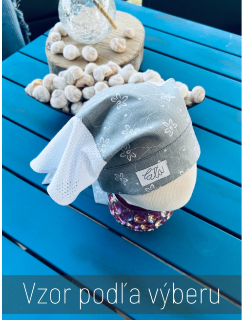 Dierkovaná, ľahká, vzdušná, úpletová šatka Laura zo 100% bavlny oživená vzorovanou 100% pevnou bavlnou, ktorá skvelo kryje ušká, preto je využiteľná aj ako náhrada čiapočky, kde máte vzadu skvelé vetranie a vôľu na copík.