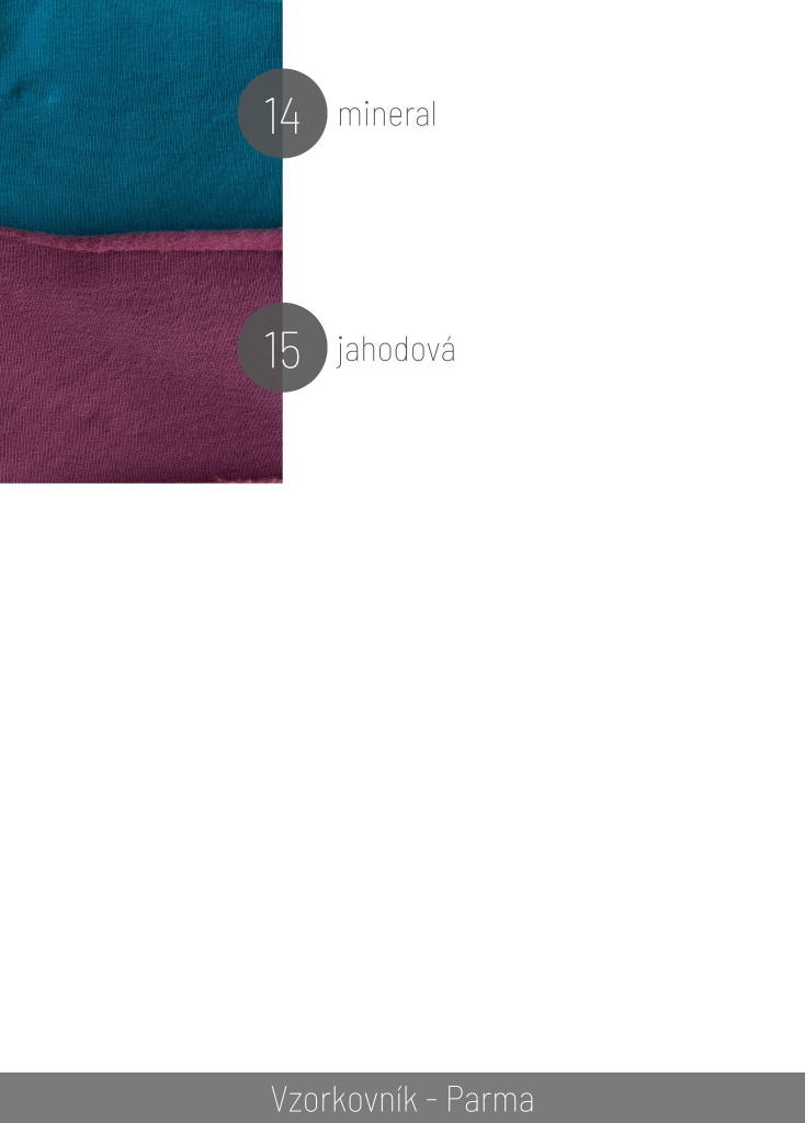 Materiál PARMA má veľkú výhodu v tom, že ide o čisto bavlnený materiál, vysoko elastický, z vnútornej strany má rozčesaný chlp, a tým je teplejšia od klasickej bavlny. Je to materiál hrúbkou medzi klasickou teplákovinou a warmkeeperom.
