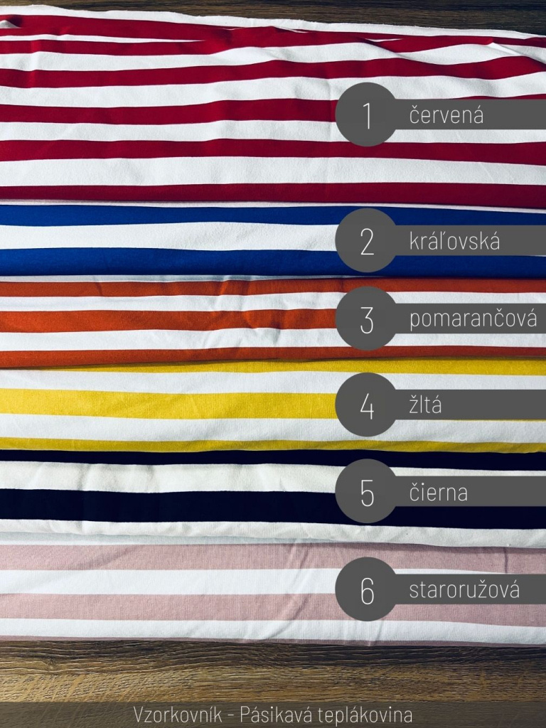 UPOZORNENIE: Okrem predvolených farieb, ktoré sú na fotkách, si môžete vybrať aj iné farby gatí z nášho vzorkovníka - PÁSIKAVÁ TEPLÁKOVINA, ktorý nájdete v galérii tohto produktu. Gate vo vami vybranej farbe vám s radosťou ušijeme. :)