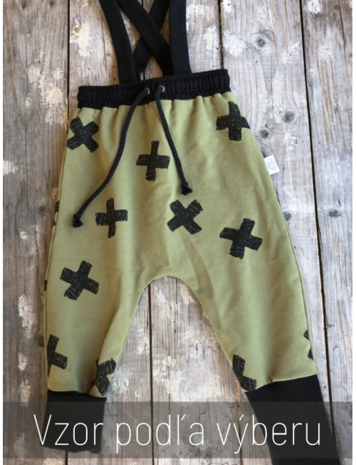 Gate pudlového strihu s rastúcou manžetou, funkčnou šnúrkou v páse a dvomi vreckami vzadu. Traky nie sú odopínateľné. Vzor samotných gatí je možné vybrať z aktuálnej ponuky nášho vzorkovníka - VZOROVANÁ TEPLÁKOVINA, pričom všetky čierne prvky na gatiach, ktoré vidíte na fotkách, ostávajú čierne (traky, vrecká, pás, manžeta,..).