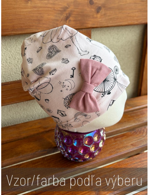 UPOZORNENIE: Okrem predvoleného vzoru čiapky, ktorý je na fotke, si môžete vybrať aj iný vzor látky čiapky z nášho vzorkovníka - VZOROVANÁ TEPLÁKOVINA L a farbu mašličky zo vzorkovníka - JEDNOFAREBNÁ TEPLÁKOVINA . Čiapku vo vami vybranom vzore a farbe vám s radosťou ušijeme. :) Ak zvolíte v kolónke FARBA možnosť "vlastný výber látky zo vzorkovníka", prosím zadajte do kolónky POZNÁMKAK PRODUKTU Kód kód vzorky a farby látky, v ktorej si želáte daný produkt ušiť. Napríklad: vzorka látky: T255 a farba mašličky: Biela T1.