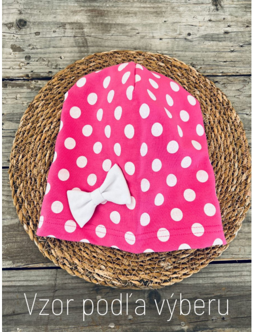 UPOZORNENIE: Okrem predvoleného vzoru čiapky, ktorý je na fotke, si môžete vybrať aj iný vzor látky čiapky z nášho vzorkovníka - VZOROVANÁ TEPLÁKOVINA L a farbu mašličky zo vzorkovníka - JEDNOFAREBNÁ TEPLÁKOVINA . Čiapku vo vami vybranom vzore a farbe vám s radosťou ušijeme. :) Ak zvolíte v kolónke FARBA možnosť "vlastný výber látky zo vzorkovníka", prosím zadajte v závere objednávky do kolónky POZNÁMKA Kód tohto produktu + kód vzorky látky, v ktorej si želáte daný produkt ušiť. Napríklad: Kód produktu: 0582, vzorka látky: T255 a farba mašličky: Biela T1.
