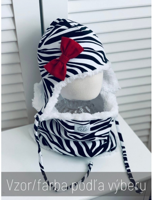 UPOZORNENIE: Okrem predvolenej farebnej kombinácie čiapky, ktorá je na fotke, si môžete vybrať aj iný vzor čiapky zo vzorkovníka - VZOROVANÁ TEPLÁKOVINA a inú farbu mašličky zo vzorkovníka - JEDNOFAREBNÁ TEPLÁKOVINA. Čapku vo vami vybranej kombinácii vám s radosťou ušijeme. :)