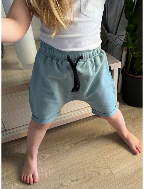 Teplákové krátke gate s vyhnutým dolným krajom. Tento pudlový strih je veľmi pohodlný. Hĺbka sedu nie je prehnaná, je navrhnutá tak, aby sa drobcovi dobre šantilo aj na odrážadle. V páse je funkčná šnúrka. Gate sú bez vreciek.