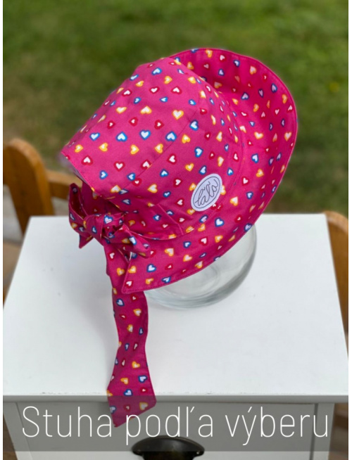 V lete by nemala byť žiadna hlávka bez klobúka. Klobúk je navrhnutý tak, aby bol v pravom slova zmysle rastúcim. Má veľký otvor vzadu a tým pádom sadne na každý obvod hlávky, ale kvôli hĺbke sme ho navrhli v štyroch veľkostiach. Klobúk využijete viacero sezón. Vnútro klobúka je stále podšité bielou bavlnou. Šilt sa odkláňa od tváričky mierne. Stuha sa pôvodne navrhla úzka kvôli malým bábätkám a chlapcom, ale máte ju v obľube aj pre väčšie slečny, tak sme ponechali na výber obe verzie stuhy úzka (2,5 cm) alebo široká (5 cm). Zo širokej stuhy uviažete bohatú mašľu pre veľké a malé parádnice.