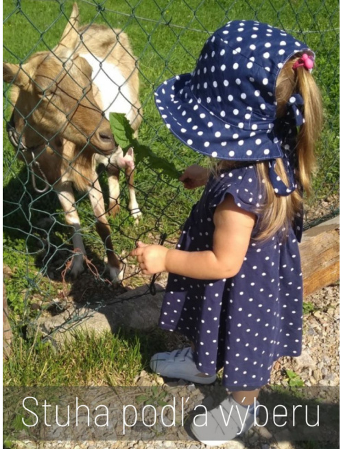V lete by nemala byť žiadna hlávka bez klobúka. Klobúk je navrhnutý tak, aby bol v pravom slova zmysle rastúcim. Má veľký otvor vzadu a tým pádom sadne na každý obvod hlávky, ale kvôli hĺbke sme ho navrhli v štyroch veľkostiach. Klobúk využijete viacero sezón. Vnútro klobúka je stále podšité bielou bavlnou. Šilt sa odkláňa od tváričky mierne. Stuha sa pôvodne navrhla úzka kvôli malým bábätkám a chlapcom, ale máte ju v obľube aj pre väčšie slečny, tak sme ponechali na výber obe verzie stuhy úzka (2,5 cm) alebo široká (5 cm). Zo širokej stuhy uviažete bohatú mašľu pre veľké a malé parádnice.