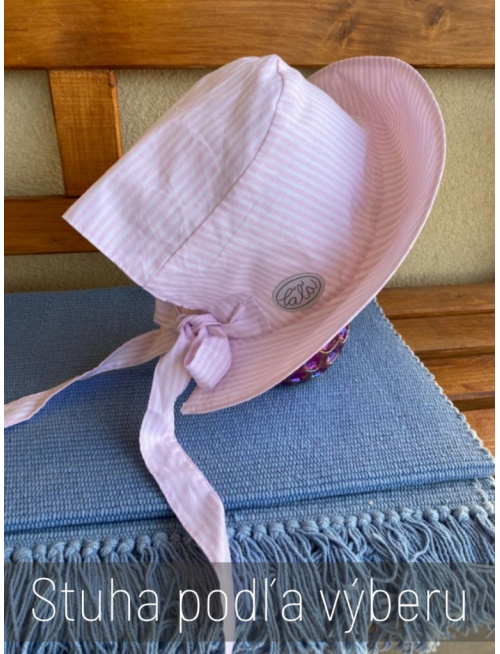 V lete by nemala byť žiadna hlávka bez klobúka. Klobúk je navrhnutý tak, aby bol v pravom slova zmysle rastúcim. Má veľký otvor vzadu a tým pádom sadne na každý obvod hlávky, ale kvôli hĺbke sme ho navrhli v štyroch veľkostiach. Klobúk využijete viacero sezón. Vnútro klobúka je stále podšité bielou bavlnou. Šilt sa odkláňa od tváričky mierne. Stuha sa pôvodne navrhla úzka kvôli malým bábätkám a chlapcom, ale máte ju v obľube aj pre väčšie slečny, tak sme ponechali na výber obe verzie stuhy úzka (2,5 cm) alebo široká (5 cm). Zo širokej stuhy uviažete bohatú mašľu pre veľké a malé parádnice.