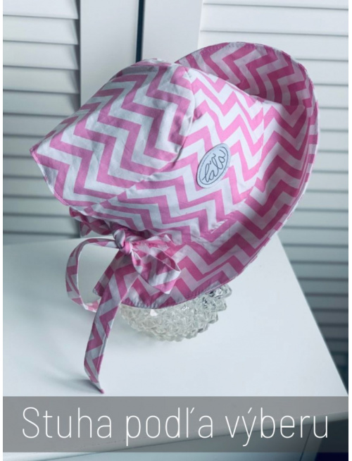 V lete by nemala byť žiadna hlávka bez klobúka. Klobúk je navrhnutý tak, aby bol v pravom slova zmysle rastúcim. Má veľký otvor vzadu a tým pádom sadne na každý obvod hlávky, ale kvôli hĺbke sme ho navrhli v štyroch veľkostiach. Klobúk využijete viacero sezón. Vnútro klobúka je stále podšité bielou bavlnou. Šilt sa odkláňa od tváričky mierne. Stuha sa pôvodne navrhla úzka kvôli malým bábätkám a chlapcom, ale máte ju v obľube aj pre väčšie slečny, tak sme ponechali na výber obe verzie stuhy úzka (2,5 cm) alebo široká (5 cm). Zo širokej stuhy uviažete bohatú mašľu pre veľké a malé parádnice.