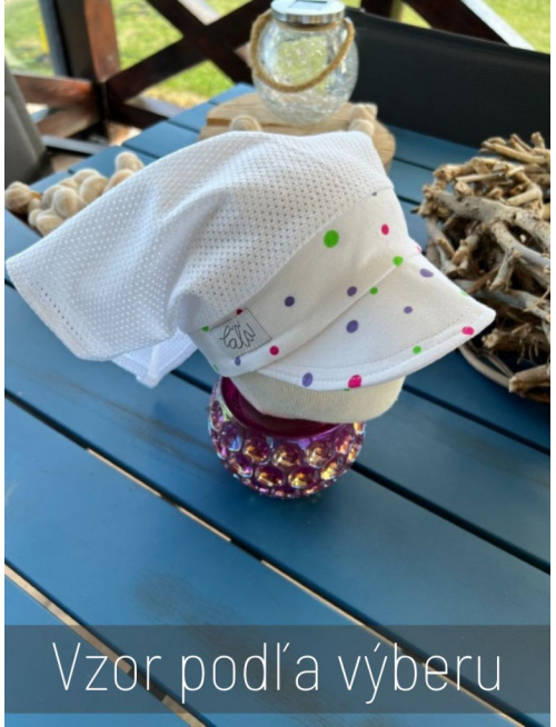 Šatka z bieleho dierkovaného úpletu kombinovaným so vzorovaným úpletom so šiltom na pevno, ktorá skvelo kryje ušká, preto je využiteľná aj ako náhrada čiapočky, kde máte vzadu skvelé vetranie a vôľu na copík. Vďaka svojej elasticite je vhodná na viacero sezón.