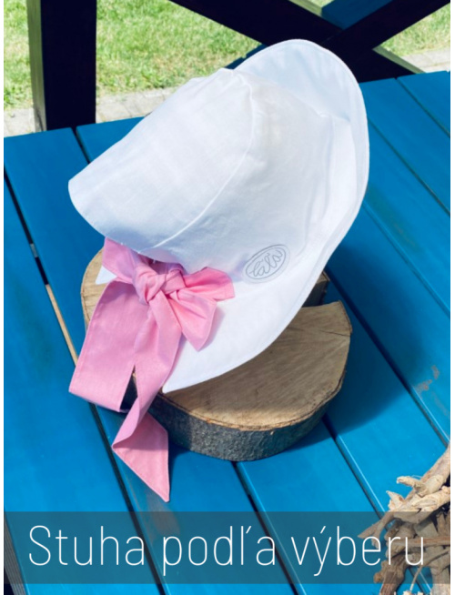 V lete by nemala byť žiadna hlávka bez klobúka. Klobúk je navrhnutý tak, aby bol v pravom slova zmysle rastúcim. Má veľký otvor vzadu a tým pádom sadne na každý obvod hlávky, ale kvôli hĺbke sme ho navrhli v štyroch veľkostiach. Klobúk využijete viacero sezón. Vnútro klobúka je stále podšité bielou bavlnou. Šilt sa odkláňa od tváričky mierne. Stuha sa pôvodne navrhla úzka kvôli malým bábätkám a chlapcom, ale máte ju v obľube aj pre väčšie slečny, tak sme ponechali na výber obe verzie stuhy úzka (2,5 cm) alebo široká (5 cm). Zo širokej stuhy uviažete bohatú mašľu pre veľké a malé parádnice.