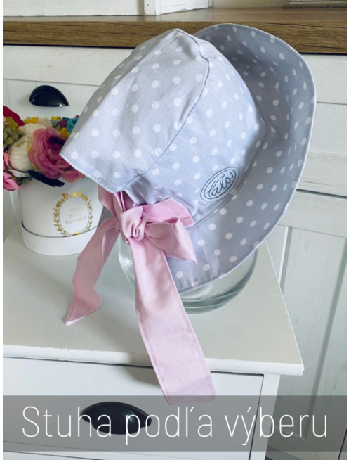 V lete by nemala byť žiadna hlávka bez klobúka. Klobúk je navrhnutý tak, aby bol v pravom slova zmysle rastúcim. Má veľký otvor vzadu a tým pádom sadne na každý obvod hlávky, ale kvôli hĺbke sme ho navrhli v štyroch veľkostiach. Klobúk využijete viacero sezón. Vnútro klobúka je stále podšité bielou bavlnou. Šilt sa odkláňa od tváričky mierne. Stuha sa pôvodne navrhla úzka kvôli malým bábätkám a chlapcom, ale máte ju v obľube aj pre väčšie slečny, tak sme ponechali na výber obe verzie stuhy úzka (2,5 cm) alebo široká (5 cm). Zo širokej stuhy uviažete bohatú mašľu pre veľké a malé parádnice.