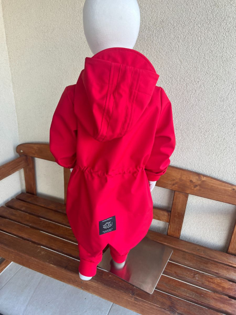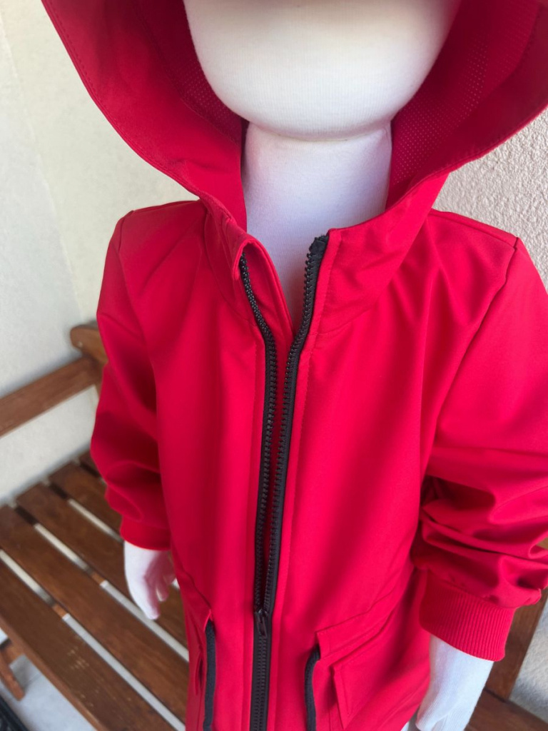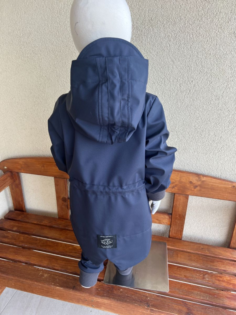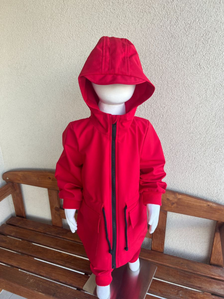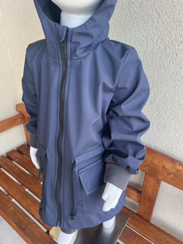 Prechodná prepracovaná sofshellová bundička je ušitá z jednej vrstvy jesenného softshellu. Bunda má funkčné nakladané prepracované vrecká a rastúce manžety. Zadný diel je predĺžený so zobáčikovým rázporkom. Bunda siaha pod zadok a sčasti chráni drobca pred mokrom pri sedení. V páse je funkčná sťahovacia šnúrka. Kapucňa je so stojáčikom, čiže parádne kryje krk pred vetrom. Kapucňa má pridaný šilt a tiež sťahovanie pre reguláciu hĺbky kapucne. Zips má podkryt, aby sa vetrík nedostal pod bundičku. Je vhodná do sychravého daždivého počasia. Celá bundička je navrhnutá tak, aby poslúžila aj ako pršiplášť, a tiež ako štýlová bundička.