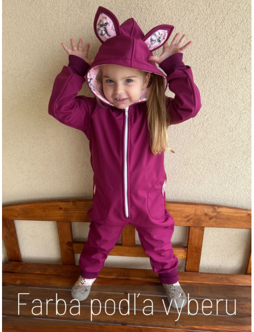 Funkčný overal zo zimného softshellu s vreckami, podšitou kapucňou a rastúcimi manžetami z patentoviny vhodný na jesenné a zimné obdobie. Typ uší si môžete vybrať z ponuky: macko, zajo, líška alebo mačka cez poznámku na konci objednávky.