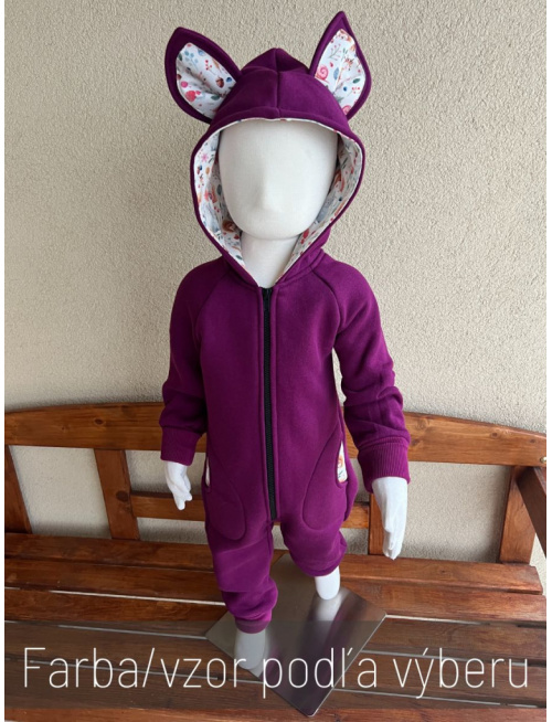 Overalik z počesanej teplákoviny s vreckami a podšitou kapucňou. Vnútro vreciek, kapucne a uší je vzorované. Vzor si môžete zvoliť z nášho vzorkovníka - VZOROVANÁ TEPLÁKOVINA. Vybraný vzor je potrebné vpísať do poznámky.