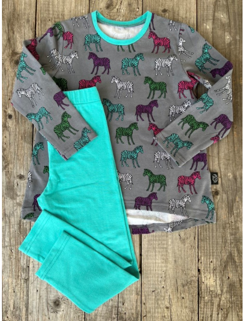 Pohodlné detské pyžamko pre malé parádnice. Tunika je navrhnutá špeciálne v ĽAĽA dielni, strih je rozšírený do Á-čka a predĺžený, navrhnutý tak, aby malej princezničke bolo príjemne pri hraní aj spaní. Spodok je legínového strihu, ale v pohodlnej širšej verzii v porovnaní s úpletovými letnými legínami.