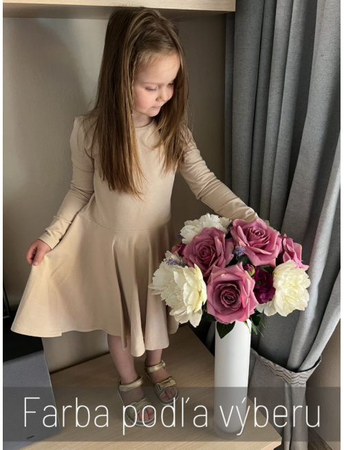 Elegantné šaty s dlhým rukávom a kruhovou sukňou. Strih kruhovej sukne vytvára pri točení waw efekt, ktorý je podmienkou každej malej parádnice. Pre pohodlnejší a elegantnejší vzhľad sme pri teplákovej verzii šiat zvolili po novom výstrih s elegantnou podsádkou viď. posledná fotka v galérii produktu.