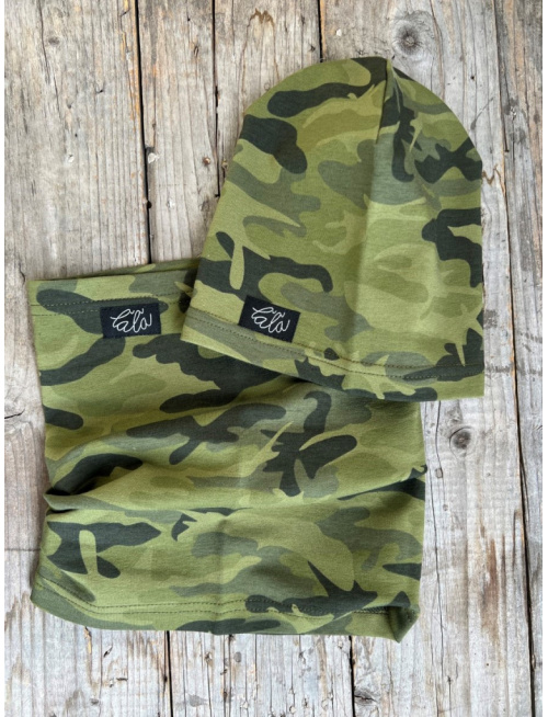 Príjemne elastický set tepláková čiapka v predĺženom strihu + tunel.