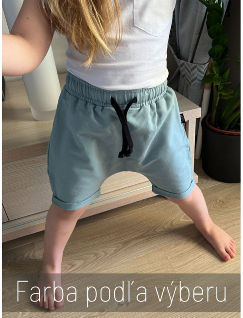 Teplákové krátke gate s vyhnutým dolným krajom. Tento pudlový strih je veľmi pohodlný. Hĺbka sedu nie je prehnaná, je navrhnutá tak, aby sa drobcovi dobre šantilo aj na odrážadle. V páse je funkčná šnúrka. Gate sú bez vreciek.