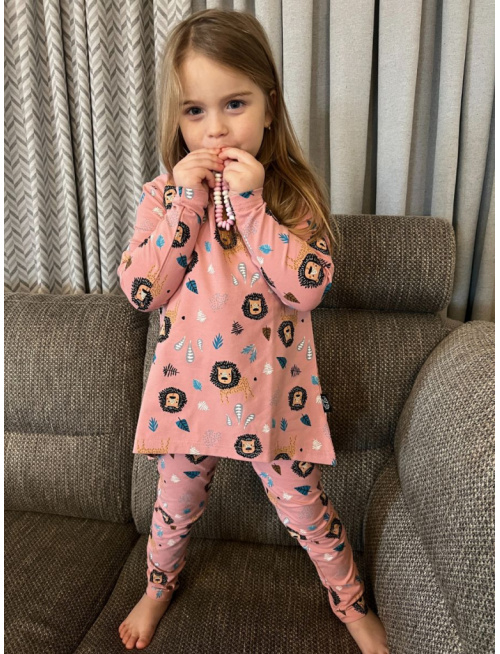 Pohodlné detské pyžamko pre malé parádnice, ktoré po novom vždy šijeme s rastúcimi manžetami. Tunika je navrhnutá špeciálne v ĽAĽA dielni, strih je rozšírený do Á-čka a predĺžený, navrhnutý tak, aby malej princezničke bolo príjemne pri hraní aj spaní. Spodok je legínového strihu, ale v pohodlnej širšej verzii v porovnaní s úpletovými letnými legínami.