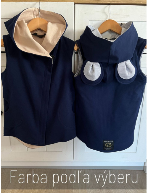 Extra prepracovaná vesta celopodšitá teplákovinou vhodná pre detičky do školy/škôlky, aby mali chrbátik a bruško v teple. Vestička má vrecká. Ušká si môžete vybrať z týchto variantov: ZAJAČIK, MACKO alebo LÍŠKA/MAČKA/VĹČIK/HAVKO. Vybraný variant ušiek je potrebné vpísať do poznámky na konci objednávky.