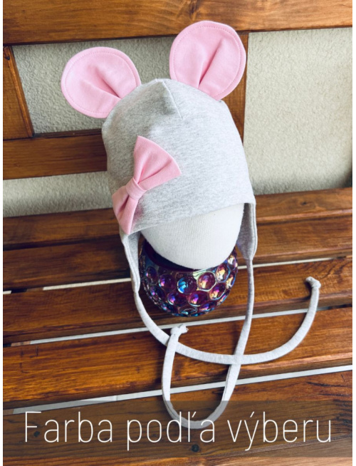 Tepláková ušiačka so šnúrkami na jarno-jesenné obdobie obohatená 3D mašličkou na boku a myška uškami. Na uškách je vždy látka dvojmo, vďaka čomu čiapka skvelo kryje a chráni detičkám ušká.