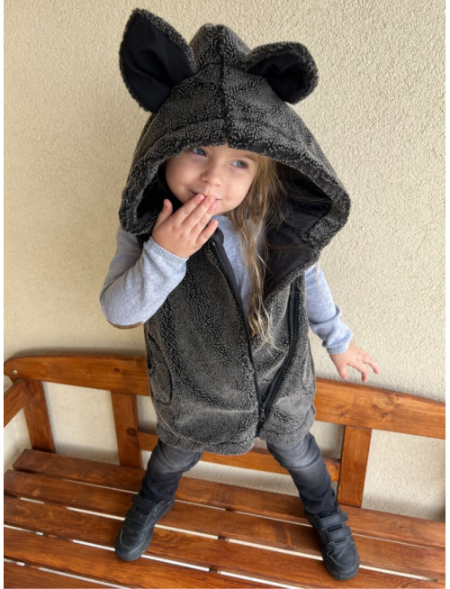 Vesta z hrubej kožušiny podšitá podšívkou. Vesta má šikmozips a tým pádom aj hlbokú kapucňu. Vesta má funkčné vrecká a jemne predĺžený zadný diel. Vesta je vhodná na jeseň a suchú zimu.