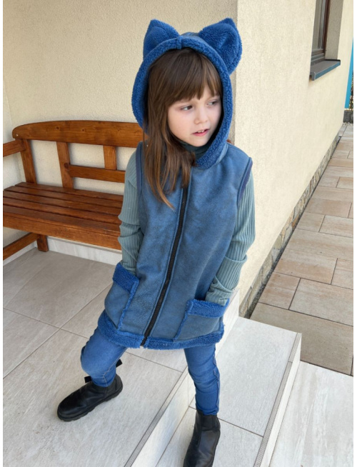 Teddy vesta s uškami - ALEX - rovno zips - petrolej - Líška/vlk