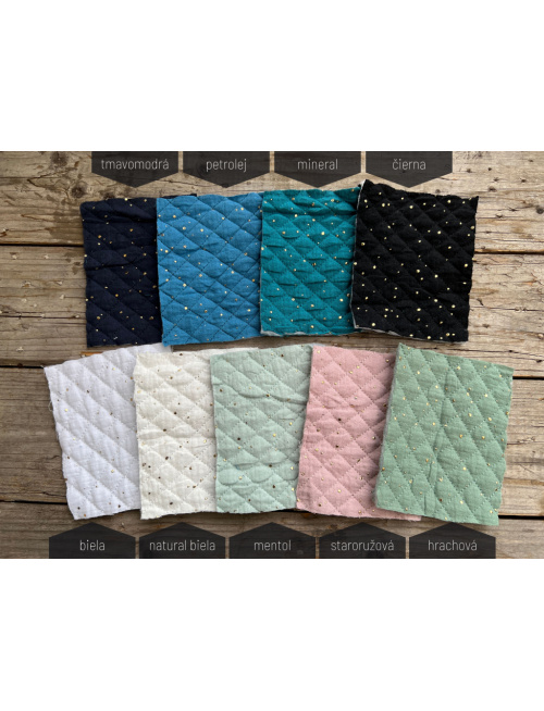 Vzorkovník - Mušelín/Dvojitá zateplená prešívaná gázovina so zlatými fŕkancami