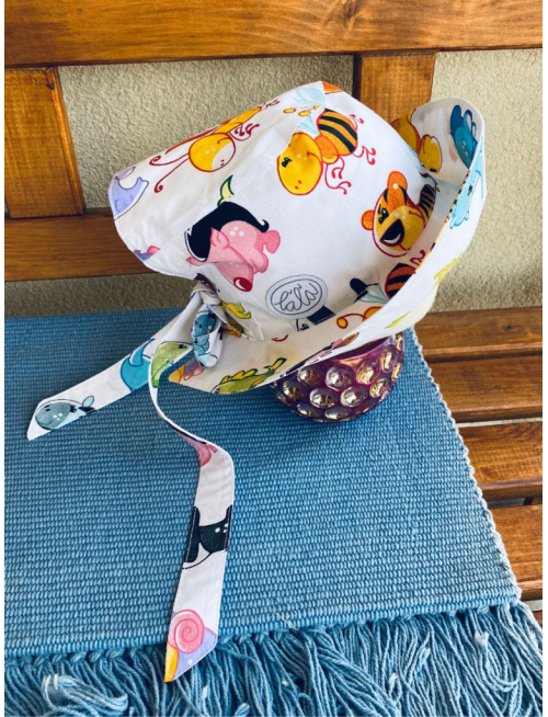 V lete by nemala byť žiadna hlávka bez klobúka. Klobúk je navrhnutý tak, aby bol v pravom slova zmysle rastúcim. Má veľký otvor vzadu a tým pádom sadne na každý obvod hlávky, ale kvôli hĺbke sme ho navrhli v štyroch veľkostiach. Klobúk využijete viacero sezón. Vnútro klobúka je stále podšité bielou bavlnou. Šilt sa odkláňa od tváričky mierne. Stuha sa pôvodne navrhla úzka kvôli malým bábätkám a chlapcom, ale máte ju v obľube aj pre väčšie slečny, tak sme ponechali na výber obe verzie stuhy úzka (2,5 cm) alebo široká (5 cm). Zo širokej stuhy uviažete bohatú mašľu pre veľké a malé parádnice.