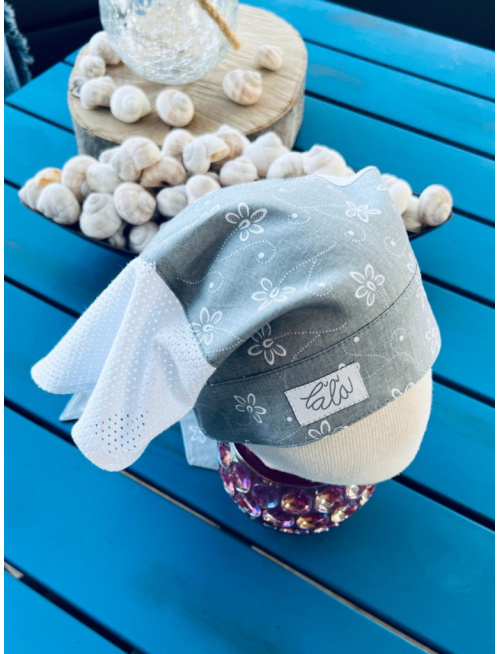Dierkovaná, ľahká, vzdušná, úpletová šatka Laura zo 100% bavlny oživená vzorovanou 100% pevnou bavlnou, ktorá skvelo kryje ušká, preto je využiteľná aj ako náhrada čiapočky, kde máte vzadu skvelé vetranie a vôľu na copík.