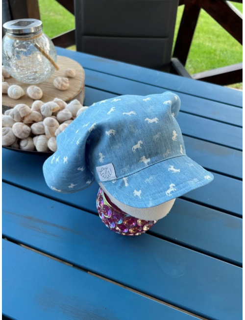 Riflová šatka so šiltom na uzol, ktorá skvelo kryje ušká, preto je využiteľná aj ako náhrada čiapočky, kde máte vzadu skvelé vetranie a vôľu na copík.