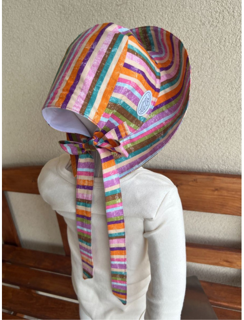 V lete by nemala byť žiadna hlávka bez klobúka. Klobúk je navrhnutý tak, aby bol v pravom slova zmysle rastúcim. Má veľký otvor vzadu a tým pádom sadne na každý obvod hlávky, ale kvôli hĺbke sme ho navrhli v štyroch veľkostiach. Klobúk využijete viacero sezón. Vnútro klobúka je stále podšité bielou bavlnou. Šilt sa odkláňa od tváričky mierne. Stuha sa pôvodne navrhla úzka kvôli malým bábätkám a chlapcom, ale máte ju v obľube aj pre väčšie slečny, tak sme ponechali na výber obe verzie stuhy úzka (2,5 cm) alebo široká (5 cm). Zo širokej stuhy uviažete bohatú mašľu pre veľké a malé parádnice.