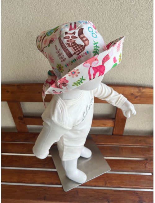 V lete by nemala byť žiadna hlávka bez klobúka. Klobúk je navrhnutý tak, aby bol v pravom slova zmysle rastúcim. Má veľký otvor vzadu a tým pádom sadne na každý obvod hlávky, ale kvôli hĺbke sme ho navrhli v štyroch veľkostiach. Klobúk využijete viacero sezón. Vnútro klobúka je stále podšité bielou bavlnou. Šilt sa odkláňa od tváričky mierne. Stuha sa pôvodne navrhla úzka kvôli malým bábätkám a chlapcom, ale máte ju v obľube aj pre väčšie slečny, tak sme ponechali na výber obe verzie stuhy úzka (2,5 cm) alebo široká (5 cm). Zo širokej stuhy uviažete bohatú mašľu pre veľké a malé parádnice.