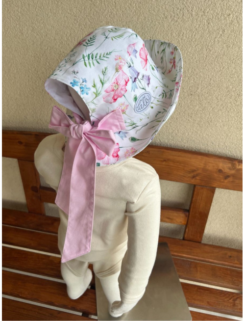 V lete by nemala byť žiadna hlávka bez klobúka. Klobúk je navrhnutý tak, aby bol v pravom slova zmysle rastúcim. Má veľký otvor vzadu a tým pádom sadne na každý obvod hlávky, ale kvôli hĺbke sme ho navrhli v štyroch veľkostiach. Klobúk využijete viacero sezón. Vnútro klobúka je stále podšité bielou bavlnou. Šilt sa odkláňa od tváričky mierne. Stuha sa pôvodne navrhla úzka kvôli malým bábätkám a chlapcom, ale máte ju v obľube aj pre väčšie slečny, tak sme ponechali na výber obe verzie stuhy úzka (2,5 cm) alebo široká (5 cm). Zo širokej stuhy uviažete bohatú mašľu pre veľké a malé parádnice.