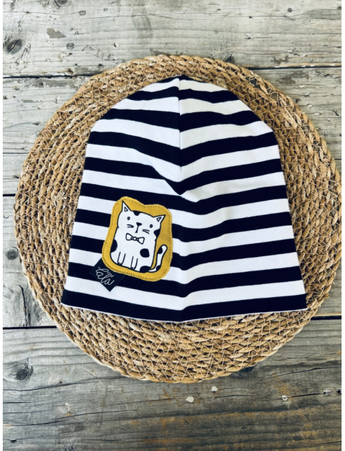 Pásikavá čiapka v predĺženom strihu obohatená aplikáciou KOCÚR, príjemne elastická.