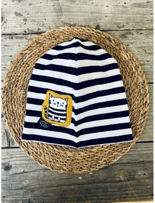 Pásikavá čiapka v predĺženom strihu obohatená aplikáciou KOCÚR, príjemne elastická.