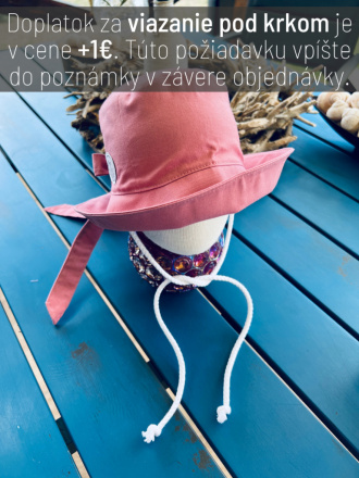 V prípade záujmu o klobúčik s viazaním pod krkom nám túto požiadavku vpíšte takisto do poznámky v závere objednávky. Doplatok za viazanie pod krkom je v cene +1€. Po prijatí objednávky doplatok doplníme manuálne do finálnej faktúry, ktorú vám pred úhradou zašleme e-mailom.