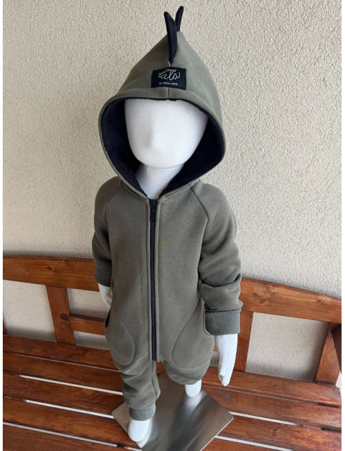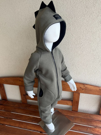 Overalik DINO s ostňami z počesanej teplákoviny s vreckami a podšitou kapucňou. Verzia LUX znamená, že farba ostní, vnútra kapucne a vnútra vreciek je iná ako farba overalu.