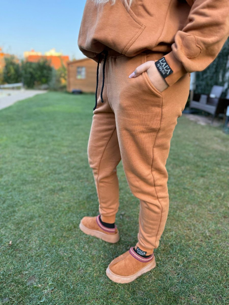Nohavice z počesanej teplákoviny. Tento strih má rozšírený sed (ale nie pudlový), vďaka čomu sú tieto nohavuce maximálne pohodlné napriek tomu, že sú od kolien dole zúžené, ukončené manžetou z patentoviny. V páse je patentovina posilnená gumou a doplnená funkčou šnúrkou.