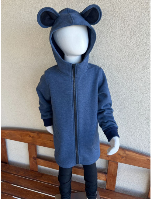 Rastúci kabátik s rovnozipsom a stojačikovou kapucňou - ALEX s uškami - počesaná teplákovina - melír modrá - POSLEDNÝ KUS