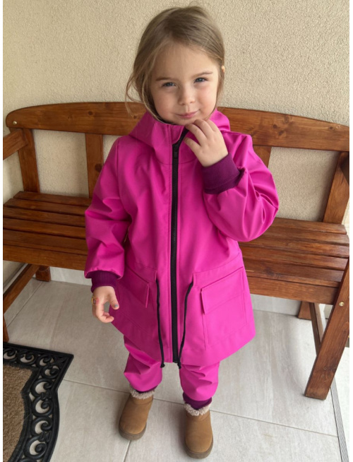Prechodná prepracovaná sofshellová bundička je ušitá z jednej vrstvy jesenného softshellu. Bunda má funkčné nakladané prepracované vrecká a rastúce manžety. Zadný diel je predĺžený so zobáčikovým rázporkom. Bunda siaha pod zadok a sčasti chráni drobca pred mokrom pri sedení. V páse je funkčná sťahovacia šnúrka. Kapucňa je so stojáčikom, čiže parádne kryje krk pred vetrom. Kapucňa má pridaný šilt a tiež sťahovanie pre reguláciu hĺbky kapucne. Zips má podkryt, aby sa vetrík nedostal pod bundičku. Je vhodná do sychravého daždivého počasia. Celá bundička je navrhnutá tak, aby poslúžila aj ako pršiplášť, a tiež ako štýlová bundička.