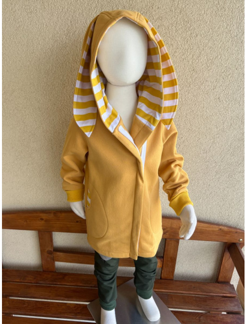 Rastúci kabátik so šikmozipsom, uškami a podšitou kapucňou - tenká počesaná teplákovina - okrová + žltý pásik