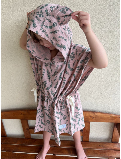 Detské pončo macko uši - eukalyptus na svetlej staroružovej - gázovina/mušelín