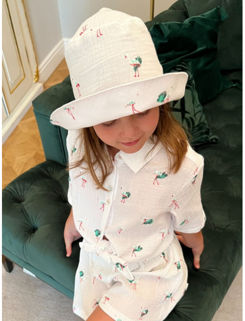 Klobúk Number 1 - gázovina/mušelín - plameniak na bielom podklade