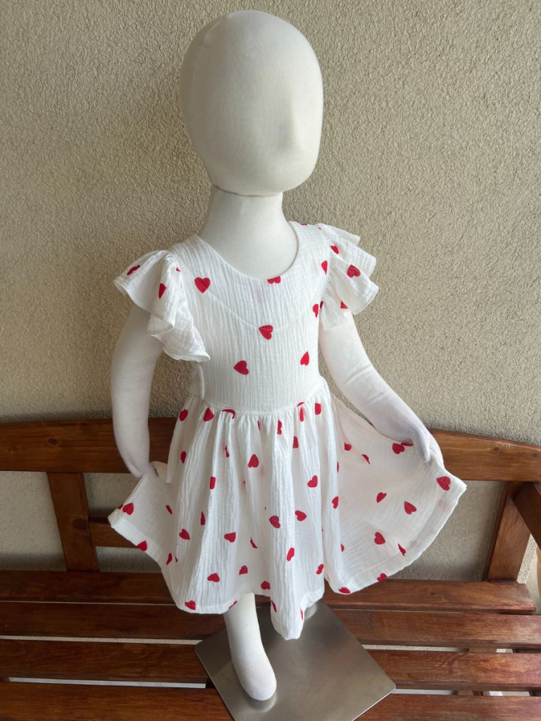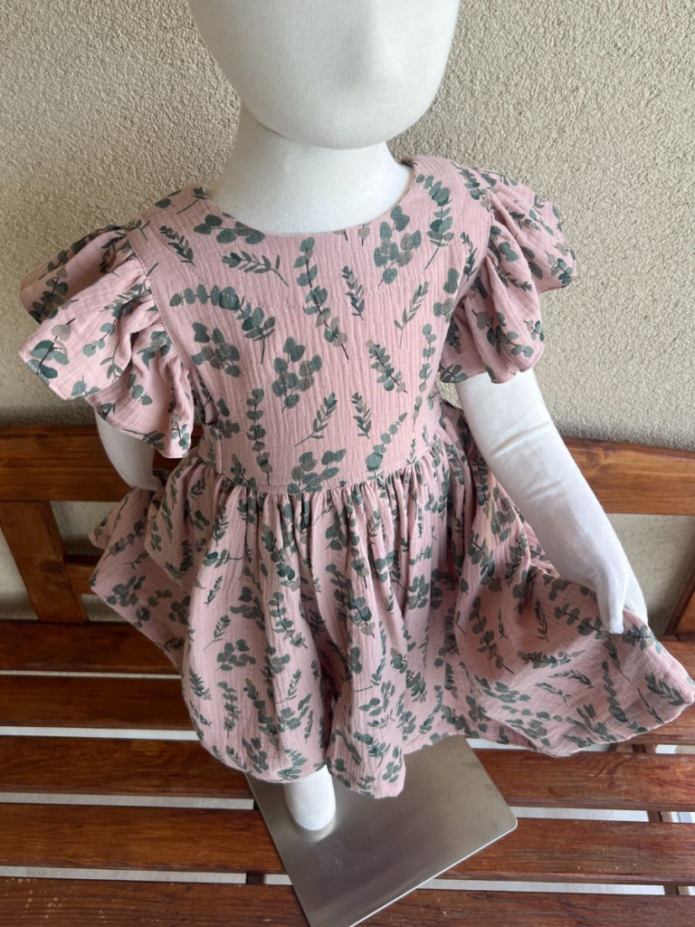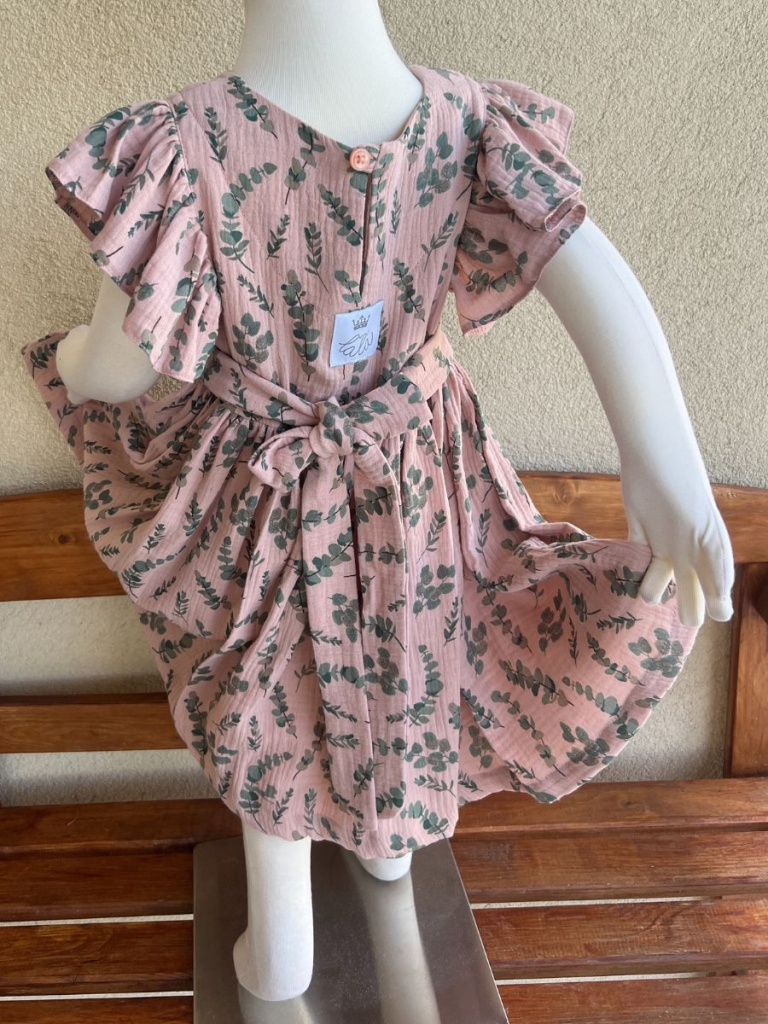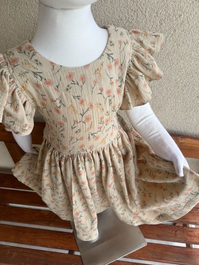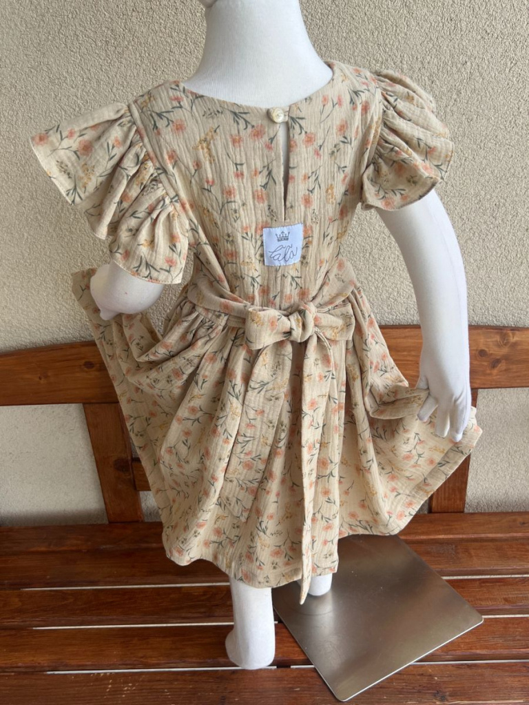 Kedže šaty Valéria v boho štýle patria medzi vaše najobľúbenejšie, zvolili sme takmer totožný strih s bohato riasenou sukňou aj pre gázovinu, kde je ale totožná dĺžka sukne vpredu aj vzadu. Šaty sú spestrené bohato riaseným volánom namiesto rukávov. Kedže sú šaty ušité z gázoviny, zapínanie vzadu je na gombík, aby prešli pohodlne cez hlávku. Šaty sú v páse dostatočne široké a šírku šiat si regulujete pridanou stuhou, ktorú slečne zaviažete vzadu na mašľu. Vďaka mašli ich v páse stiahnete tak, ako vám vyhovuje.