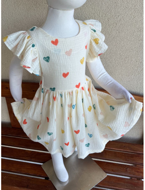 Šaty Valeriána - gázovina/mušelín - farebné srdiečka na maslovom podklade