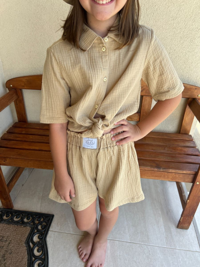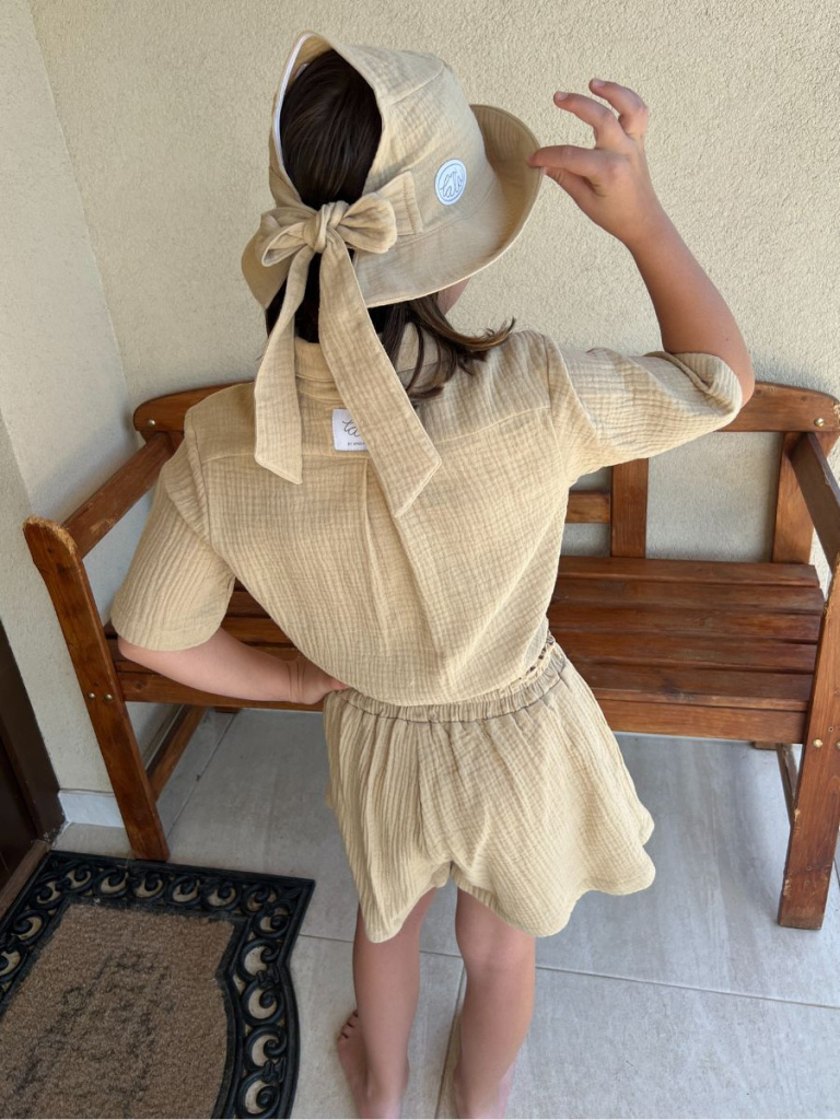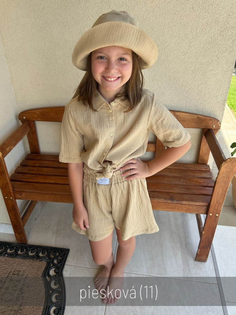 Chlapčenská súprava HAWAI z materiálu gázovina (košeľa + kraťasy). Chlapčenská košeľa má oproti dievčenskej košeli vyhnutú manžetku na rukáve a dolný kraj košele je rovný, širšie zahnutý. Súprava má na zadnom dieli košele pod sedlom špecifický protizáhyb pre šmrncovnejší vzhľad, a zároveň preto, aby bola vzdušná a dobre drobcovi sadla. Košeľu môže drobec nosiť napríkad aj šmrncovne zapravenú v gatiach alebo na pláži pri vode aj rozopnutú. Kraťasy sú v pohodlnom, rovnom, dostatočne voľnom strihu, bez volánika nad pásom.