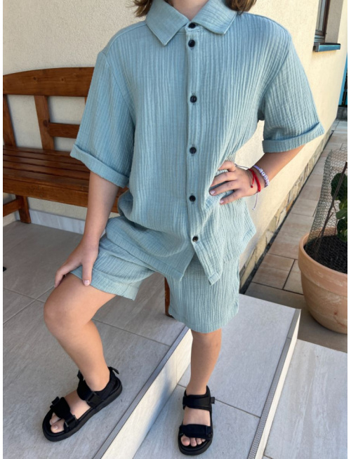 Chlapčenská súprava HAWAI z materiálu gázovina (košeľa + kraťasy). Chlapčenská košeľa má oproti dievčenskej košeli vyhnutú manžetku na rukáve a dolný kraj košele je rovný, širšie zahnutý. Súprava má na zadnom dieli košele pod sedlom špecifický protizáhyb pre šmrncovnejší vzhľad, a zároveň preto, aby bola vzdušná a dobre drobcovi sadla. Košeľu môže drobec nosiť napríkad aj šmrncovne zapravenú v gatiach alebo na pláži pri vode aj rozopnutú. Kraťasy sú v pohodlnom, rovnom, dostatočne voľnom strihu, bez volánika nad pásom.