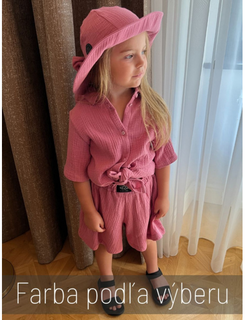 Dievčenská súprava HAWAI z materiálu gázovina (košeľa + kraťasy). Dievčenská verzia kraťasov je s volánikom nad pásom a strih kraťasov je rozšírený do širšieho Áčka. Dievčenská košela má v spodnej časti mierny oblúčik a je dosť dlhá na to, aby ste ju buď zapravili do kraťasov alebo zaviazali vpredu na uzol pre šmrncovnejší vzhľad, prípadne nechali uplne rozopnutú s nejakým tieločkom alebo športovou podprsenkou pod košeľou. Súprava má na zadnom dieli košele pod sedlom špecifický protizáhyb pre šmrncovnejší vzhľad, a zároveň preto, aby bola vzdušná a dobre detičkám sadla.