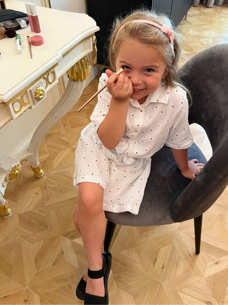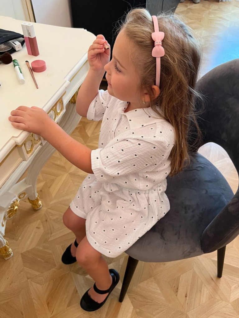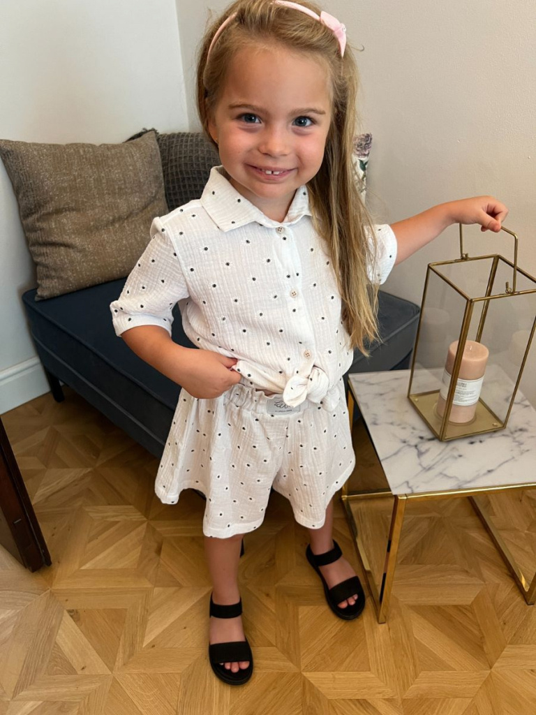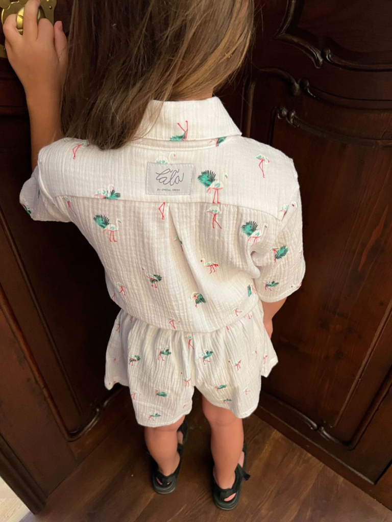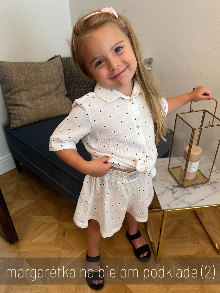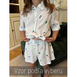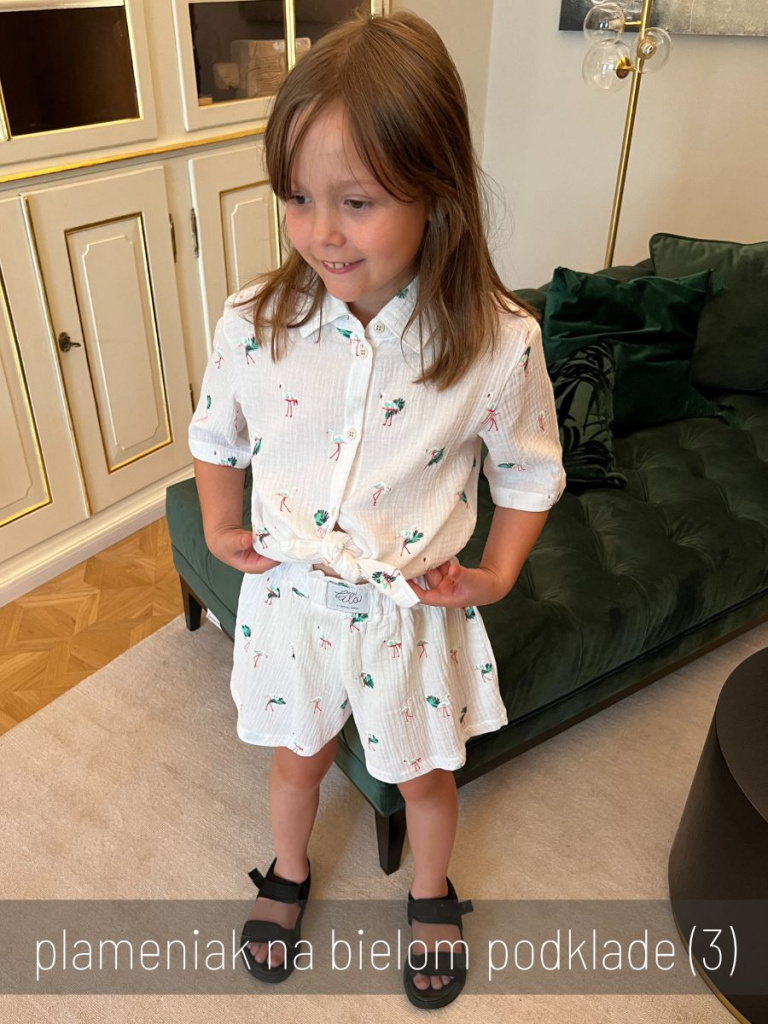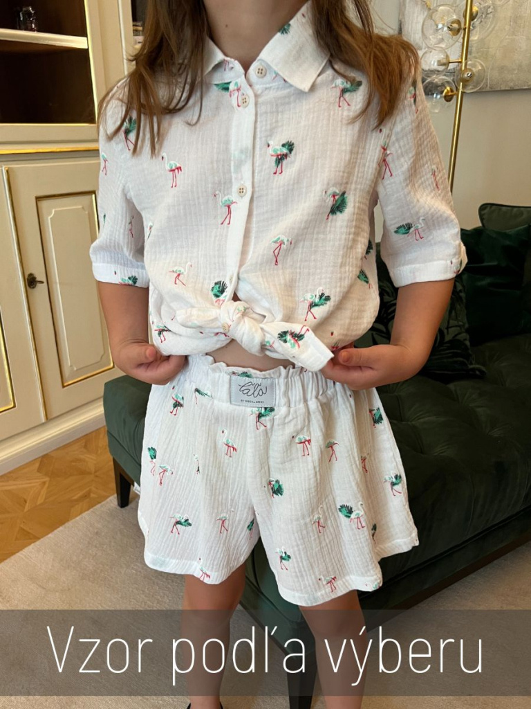 Dievčenská súprava HAWAI z materiálu gázovina (košeľa + kraťasy). Dievčenská verzia kraťasov je s volánikom nad pásom a strih kraťasov je rozšírený do širšieho Áčka. Dievčenská košela má v spodnej časti mierny oblúčik a je dosť dlhá na to, aby ste ju buď zapravili do kraťasov alebo zaviazali vpredu na uzol pre šmrncovnejší vzhľad, prípadne nechali uplne rozopnutú s nejakým tieločkom alebo športovou podprsenkou pod košeľou. Súprava má na zadnom dieli košele pod sedlom špecifický protizáhyb pre šmrncovnejší vzhľad, a zároveň preto, aby bola vzdušná a dobre detičkám sadla.
